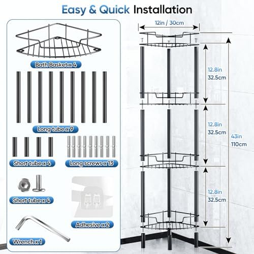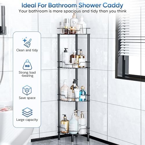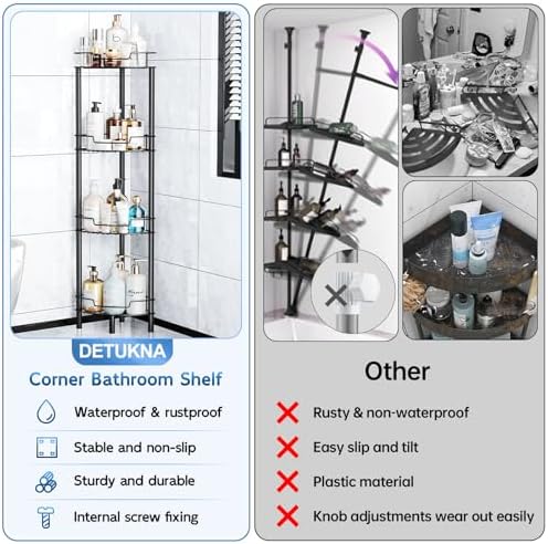 Detukna 角落淋浴架,4 层淋浴收纳架,适用于内部淋浴,不锈钢地板角落淋浴浴室架支架架,适用于浴室阳台厨房,无需钻孔,黑色