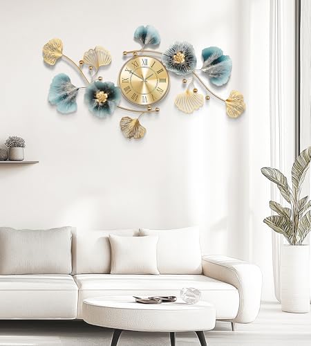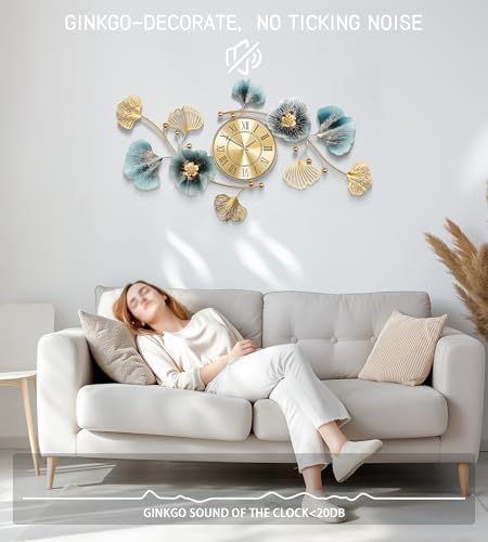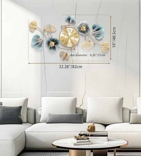 Axioglo Large Wall Clock,3D Creative Metal Ginkgo Leaf Decoration Clock, with Silent Movement Decorative Wall Clock,Large Wall Decor, for Living Room Bedroom Kitchen Office(32''x18'' )
