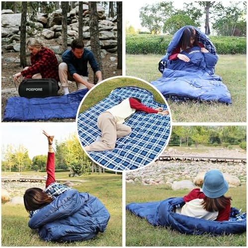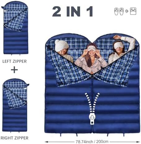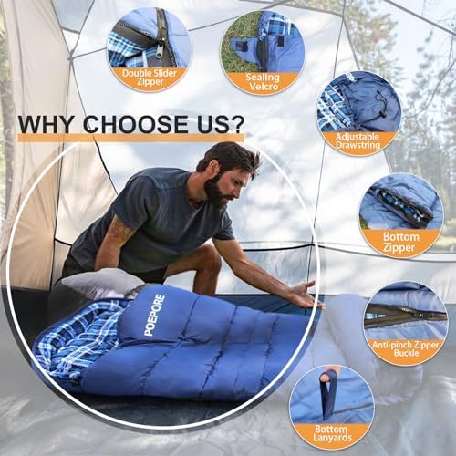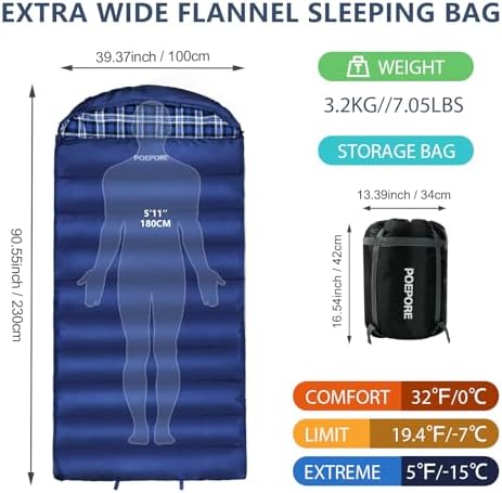 POEPORE 0 Degree Sleeping Bag 100% Cotton Flannel XXL Cold Weather Winter Oversized Sleeping Bag for Adults Camping Zero Degree Big and Tall with Compression Sack