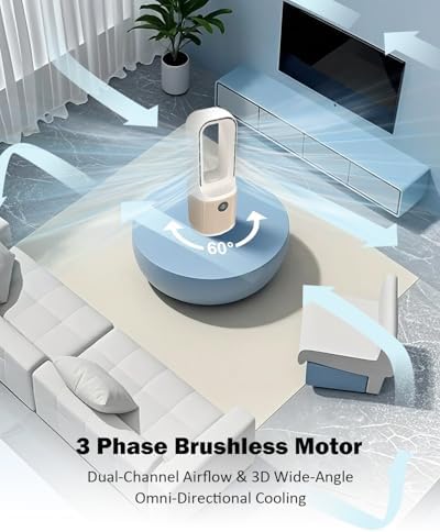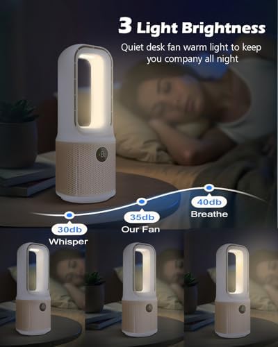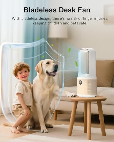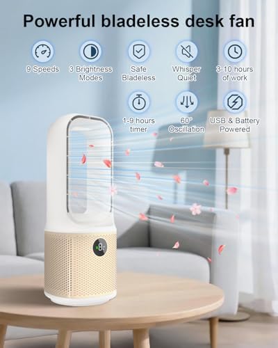 MEIIS desktop fan, small silent bladeless fan with 9-speed adjustment and 3 lighting modes, 14 inch USB rechargeable, with 5000mAh battery, 60 ° swing cooling fan, suitable for office, living room, be