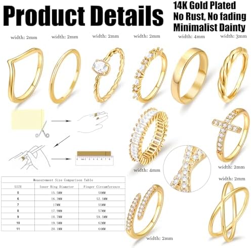 10 PCS 14K Gold Plated Rings Set for Women, Dainty Gold Knuckle Ring Non Tarnish, Simple Thumb Stacking Rings Pack Size 6\/7\/8\/9\/10