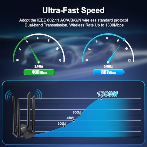 NEWFAST AC1300 USB WiFi Adapter (NF- U329), USB3.0 Wireless Dual Band Network Adapter, 2.4GHz\/5GHz USB Wi-Fi Adapter for Desktop PC, MU-MIMO, 4 Antennas, WiFi Dongle for Windows XP\/7\/8\/8.1\/10\/11