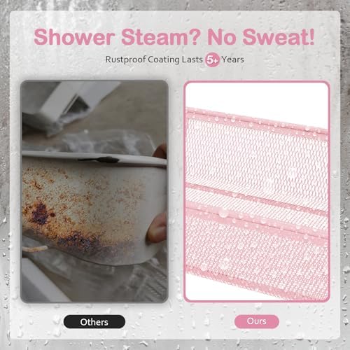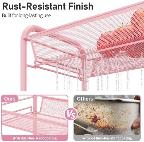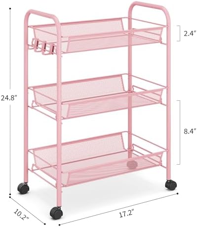TOOLF 3 Tier Rolling Utility Cart - Durable Metal Design Pink Utility Cart, Storage Trolley on Wheels with 3 Hooks, Perfect for Kitchen, Bathroom & Laundry Room Organization