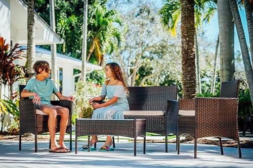 Nestl Wicker Patio Furniture - 4 Piece Set with 2 Chairs, Loveseat, Glass Top Coffee Table, Outdoor Furniture for Backyard, Pool or Porch (Brown\/Beige)