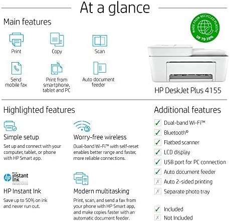 HP DeskJet Plus 4155 Wireless All-in-One Printer - Compact Inkjet Printer with Mobile Printing, Scanner, Copier, Bluetooth, Home Office & WiFi Compatible - 3XV13A (Renewed)