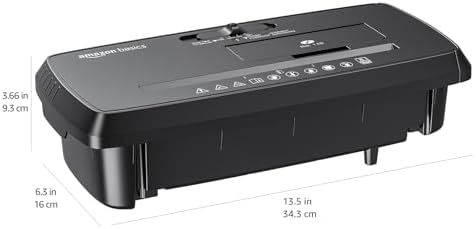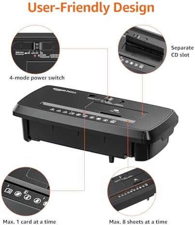 Amazon Basics 8-Sheet Strip Cut Paper, CD, and Credit Card Shredder with Auto-Off Compact, Portable Design, No Basket, Extendable Arm, Black