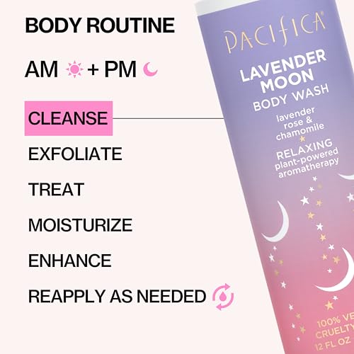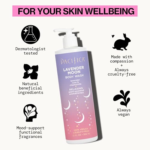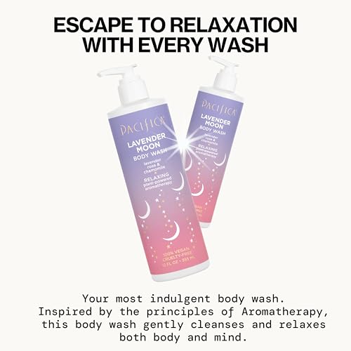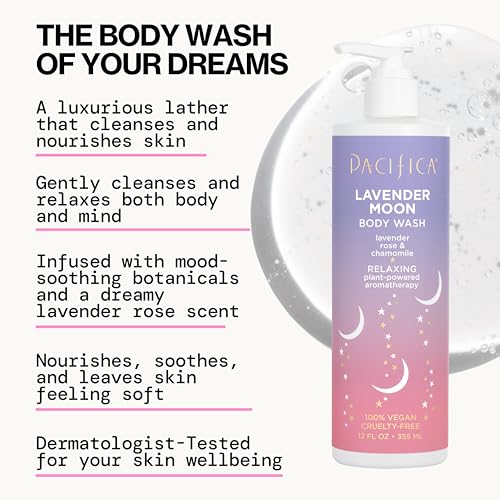 Pacifica Beauty Lavender Moon Body Wash with Pump, Bath and Shower Gel, Hyaluronic Acid, Rose, Chamomile, Moisturizing, Hydrating, Cleansing, Soothing, Calming, Relaxing, Vegan, 12 fl oz (1 Count)