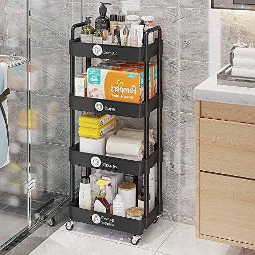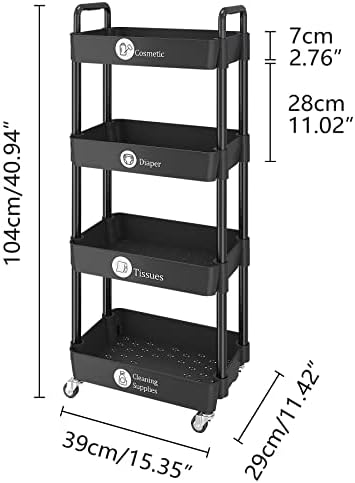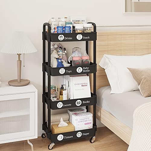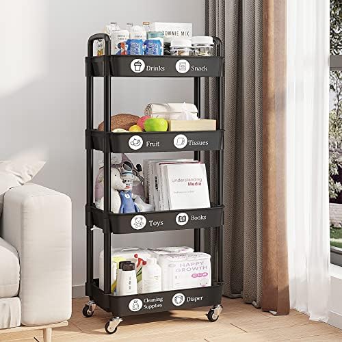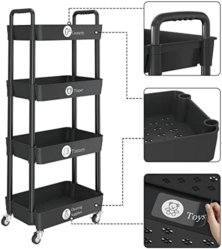 UDEAR 4-Tier Rolling Utility Cart with 12 Category Labels,Multifunctional Storage Shelves with Handle and Lockable Wheels for Room,Office,Kitchen,Bathroom,Black
