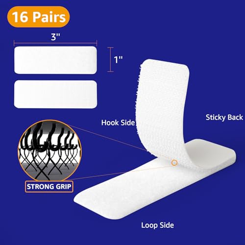 BESTAPE 16 Sets 1 x 3 Inch Adhesive Hook and Loop Fastener Strips, Heavy Duty, Strong Back Adhesive, Double-Sided Hook and Loop for School, Classroom, Office, Dorm, Home Use, White