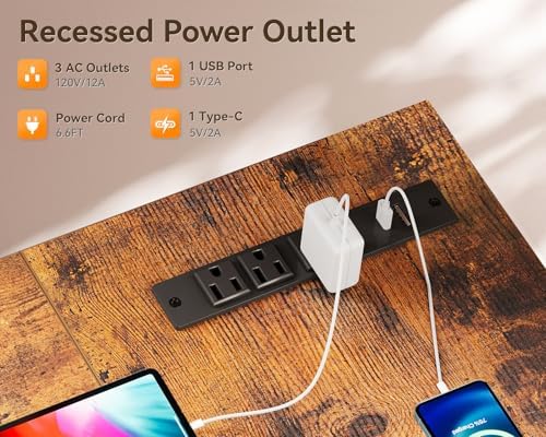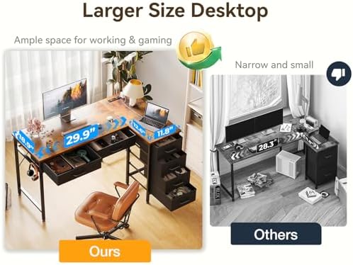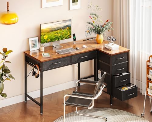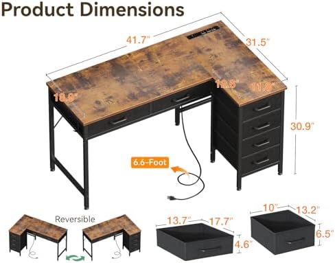 Coleshome 42 Inch L Shaped Desk with Drawers, Computer Desk with Power Outlets, Home Office Desk with 6 Drawers, Reversible Corner Desk for Small Space, Study Work Table with Hook, Vintage