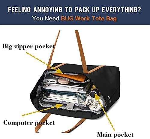 Extra large tote bag and can hold up to 15.6 inch laptop)?-the specific size is Bottom length*bottom width*height=16 x 7 x 13 inches, handle drop 10 inch. We noticed that somebody bought the tote bag for women, but thought its size is larger than expected. BUG Laptop Tote Work Bag for Women? -- Grab everything in your bag have driven you crazy? You need our BUG womens work tote bag with built-in bag organizer! Organize your work bags in the slightest from today, It contains a few compartments such as one padded pockets to protect your laptop, ipad/macbook, and other small daily items. At same time, big enough space to hold A4 folders /files, magazines, water bottle, umbrella, lunch bag, etc. Lightweight but Roomie? -- Use this as an all in one bag, and simply put all others away once you received our BUG Work tote bag. It weighs only 1.31 pounds, and padded long shoulder strap makes it further lightweight. 7’’ bottom width allows you to put in more stuff even with your laptop. Perfect work bags for women. Classy, Chic, Stylish Lady Work Laptop Bag? -- This is an elegant work totes. With in bag organizer, padded pockets , use it as an everyday bag / travel bag / business bag / work briefcase.It may be allowed to have some color differences due to different computer or phone display screen. Suitable for daily use - The simple bag body is very suitable for various daily scenarios. This women's handbag can be carried for shopping, travel, work, school, or gatherings. Make it the perfect gift that your friends, wife, daughter, mother, and teachers will love.