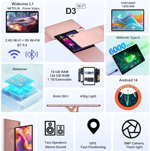 DMOAO Tablet, 10.1 Inch Tablets, Android 14 Tablet with 18GB RAM+128GB ROM\/ 1TB Expand, Octa-Core 1.8GHz CPU, 6000mAh Battery, 5G WiFi, WiFi 6, BT5.0, Widevine L1 HD IPS Tableta PC-Rose Gold