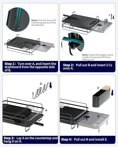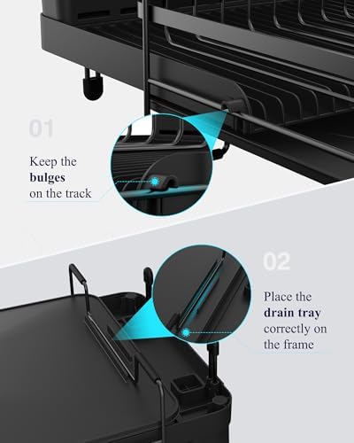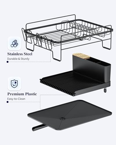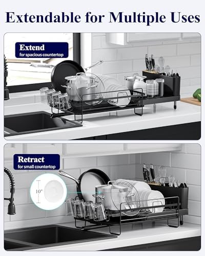 Kitsure Large Dish Drying Rack - Extendable Dish Rack, Multifunctional Dish Rack for Kitchen Counter, Anti-Rust Dish Drainers with Cutlery & Cup Holders 19.2"-26.7" L x 12.9" W, Black