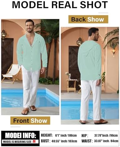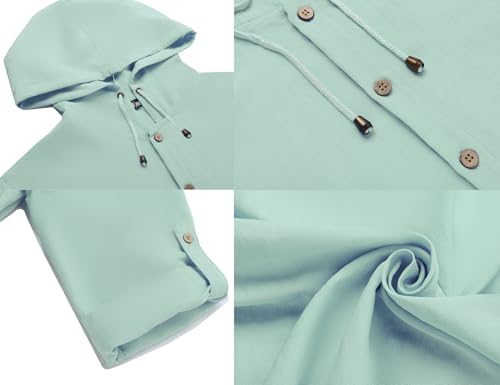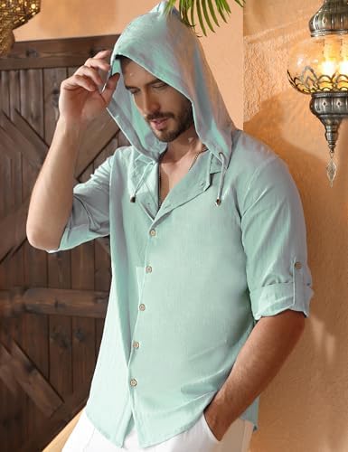 OYOZONE men's linen shirt casual button up shirt long sleeved rolled up sleeve summer beach shirt top with hood