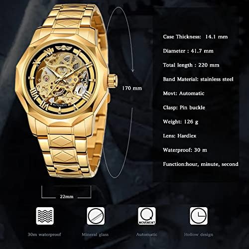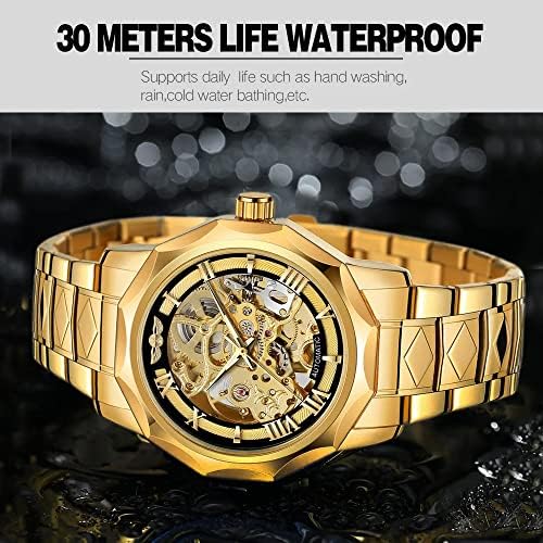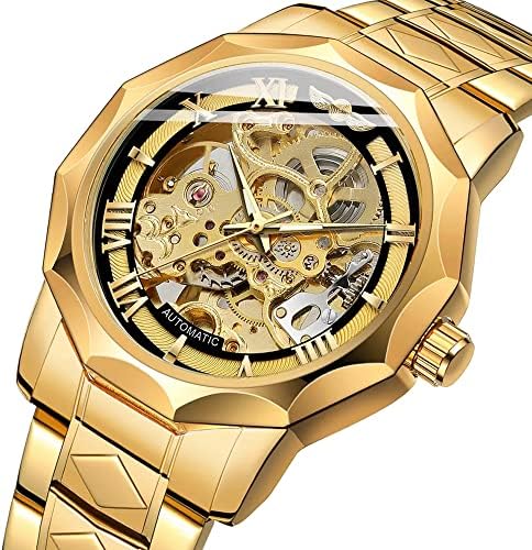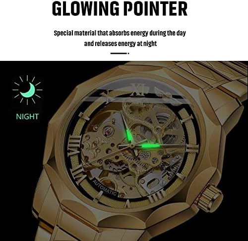 Tiong Fashion Automatic Watches Mechanical Wrist Watch Golden for Mens Skeleton Watches with Stainless Steel Transparent Dial