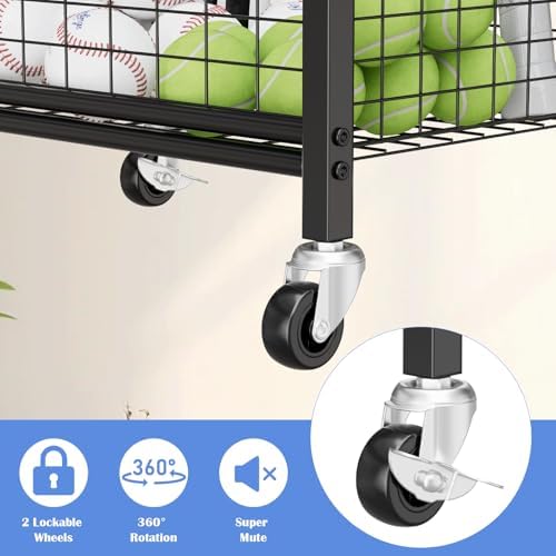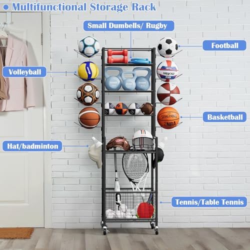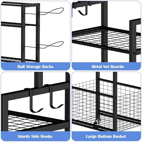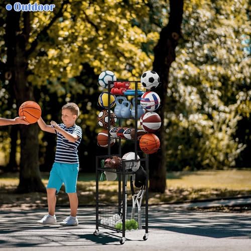 OYEAL Freestanding Ball Rack with Wheels Garage Basketball Storage Cart Outside Sports Equipment Organizer Ball Holder with Storage Baskets for Basketball, Soccer, Volleyball, Football, Black
