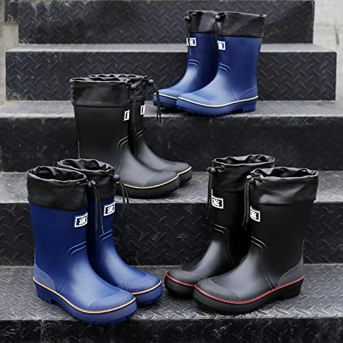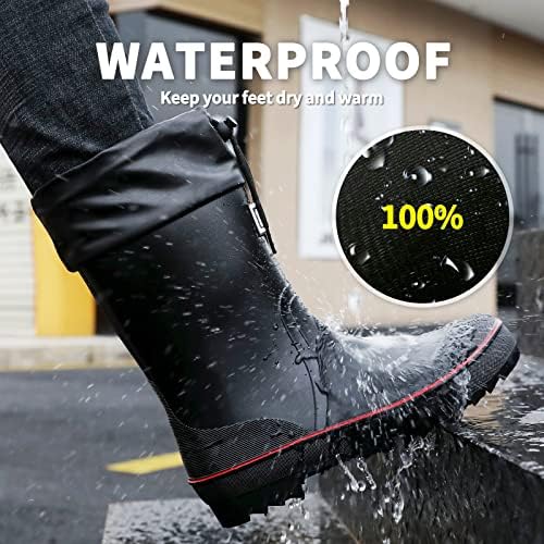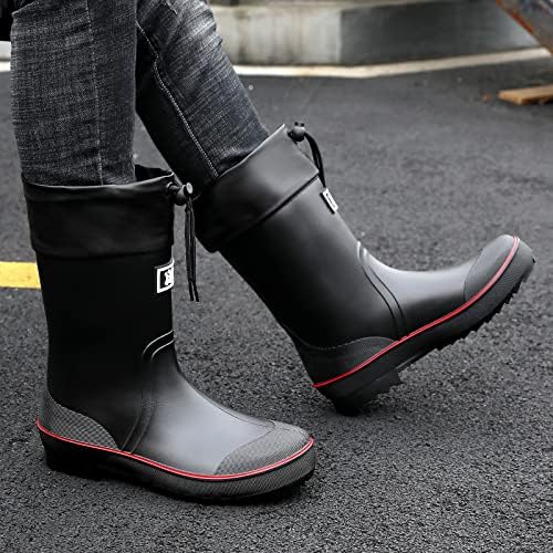 【Lightweight & Multi-Use】Our contoured mid-sole allows for lightweight cushioning, shock absorption and comfort. Rain boots keep you dry and warm, and handle even the toughest work and sports situation.The bootlace with elastic band and which are convenient for users to put on or take off, shaft provides you with more protection and durability. 【Unique Design】Rain boots men have a comfor and flexible design with thickened rubber sole, soft insole and breathable mesh. Not only having excellent air circulation and strong thermal insulation effect, but adjustable elastic band and waterproof fabric are designed at the boot mouth for easy wearing, also keeping your feet dry and comfortable after a long day at work. 【Protective Outsole & Anti-Slip】Garden working boots shank slip-resistant lug outsole gives excellent stability & extra solid traction on wet surface.The lightweight rubber mid-sole provides strong support for your feet, and the deep pattern design can effectively reduce vibration or shock when walking, providing excellent stability on uneven terrain. 【100% Waterproof】It's important to maintain dry feet especially in cold temperature. Our high grade natural rubber material which extends up above the ankle for protection from water and objects, providing extra durability and 100% waterproof. With a pair of four-season rain boots, you can do whatever you want outdoors. 【Seamless Technology】: Our rain boots use PVC polyblend injection molded construction technology, which is seamless, up to 30% lighter, and 100% waterproof. Light weight, provide resist to various liquids and sharp objects, super waterproof and anti-friction performance. Whether you are fishing, working, hunting, camping, dog-walking or playing outside.