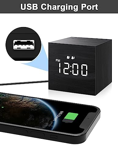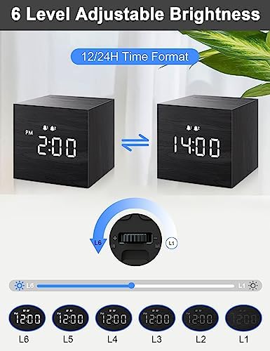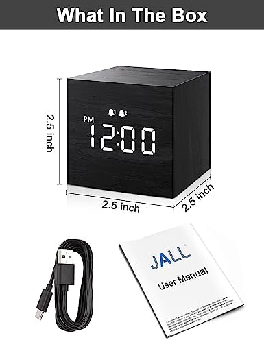 JALL Digital Alarm Clock, with Wooden Electronic LED Time Display, Dual Alarm, 2.5-inch Cubic Small Mini Wood Made Electric Clocks for Bedroom, Bedside, Desk, Black