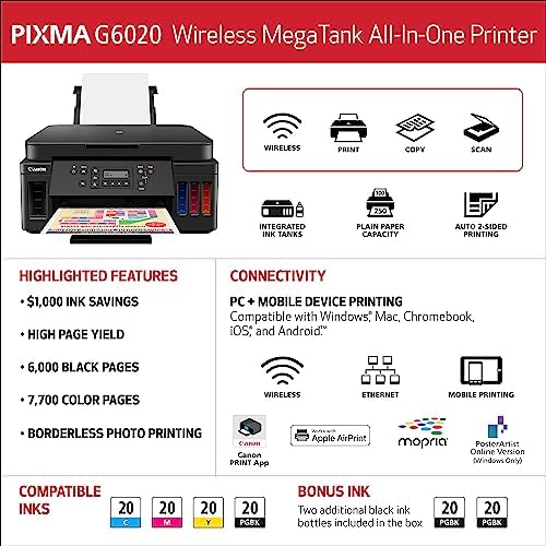 Canon PIXMA G6020 All-in-One Supertank Wireless (Megatank) Printer, Copier and Scan with Mobile Printing, Black, Works with Alexa