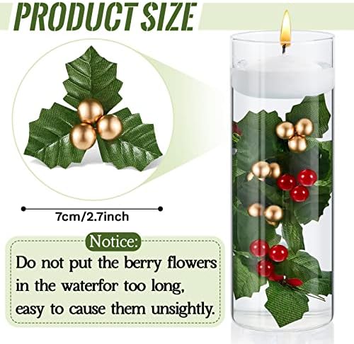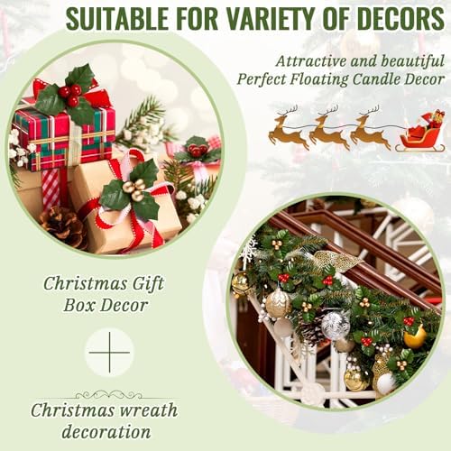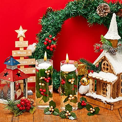 Canlierr 50 Pieces Christmas Holly Berries for Crafts Faux Berries Flowers and Holly Leaves Christmas Wreath Fillers for Vase Fillers Floating Candle Table Centerpiece(Red, Gold)