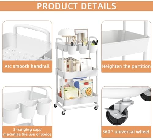 JIUYOTREE 3-Tier Plastic Rolling Storage Cart Utility Cart with Extra Hanging Cups Handles Lockable Wheels for Living Room Bathroom Kitchen Office White
