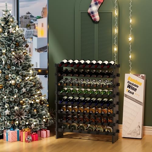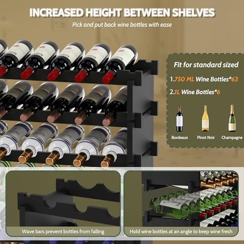 Wine Rack Freestanding Floor, Bamboo 8-Tier 69 Wine Bottle Holder Racks Countertop Cabinet Display, Wooden Stackable Modular Wine Storage Organizer Shelves for Kitchen Bar Cellar Dining Room Black