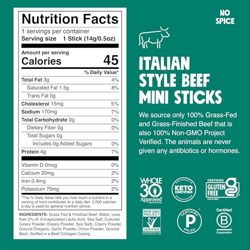 Chomps Snack Size Grass-Fed Italian Beef Jerky Snack Sticks 0.5oz 24-Pack - Keto, Paleo, Whole30, 4g Lean Meat Protein, Gluten-Free, Zero Sugar Food, Non-GMO Chomplings