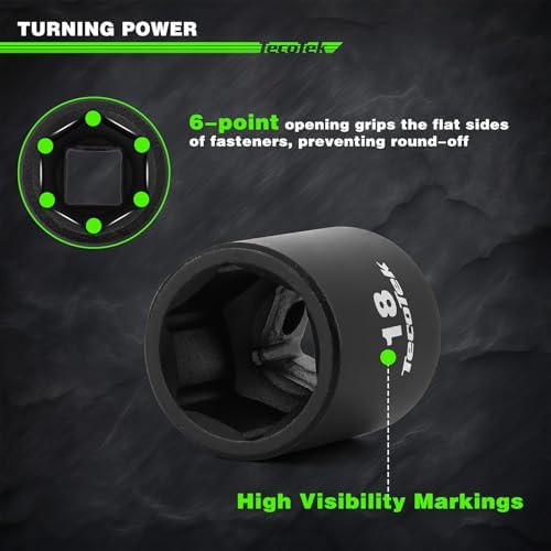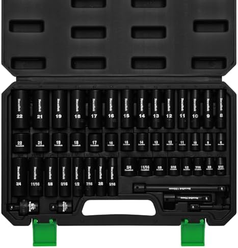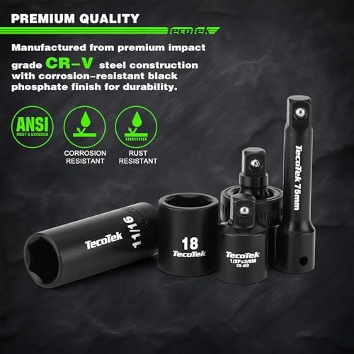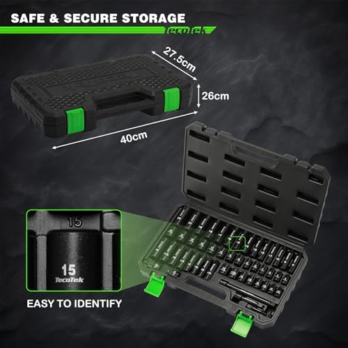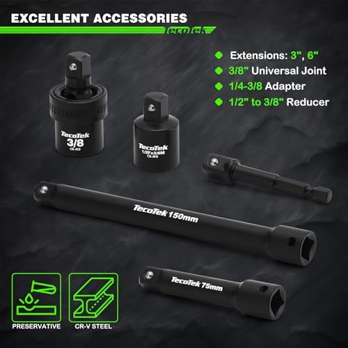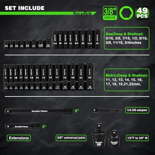 TecoTek 3\/8" Drive Impact Socket Set, 49-Piece SAE (5\/16"-3\/4") and Metric (8mm-22mm), 6 Point, Cr-V, Extension Bars, 1\/2" F to 3\/8" M Reducer, Universal Joint and Power Drill
