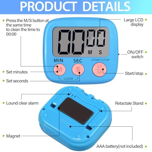 Leumoi 24 Pcs Digital Kitchen Timers Bulk Small Magnetic Timer On\/Off Switch Minute Second Count up Countdown Loud Alarm for Classroom Cooking Baking(Blue)