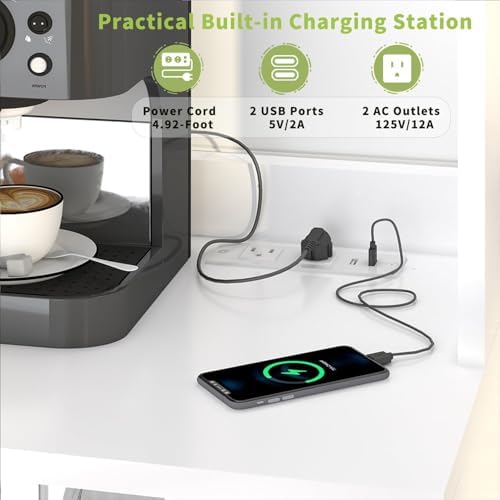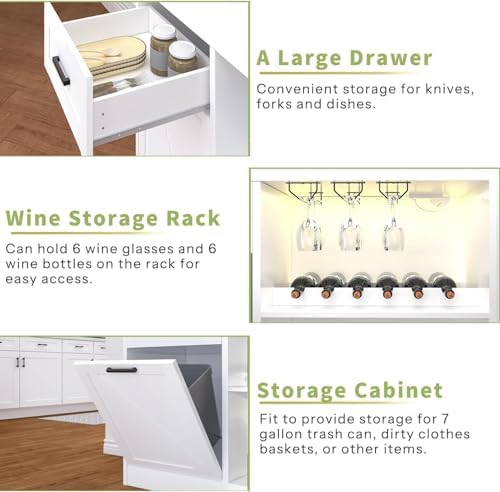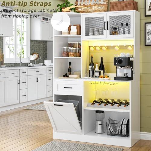 DynJest 67.3" Tall Modern Kitchen Pantry Storage Cabinet with Drawer and Shelves, Tilt Out Trash Can, Coffee Bar Wine Cabinet with LED Lights and Power Outlet, Wine Glass Rack, 2 Mesh Doors (White