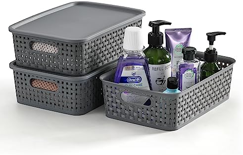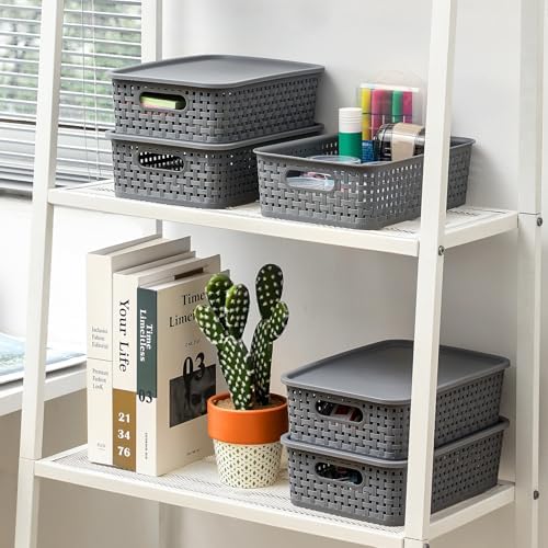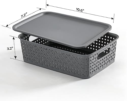 NETANY [8-piece set] plastic storage basket with lid, small food storage room storage, stackable storage box, household storage rack under cabinets, countertops, drawers, sinks or shelves, gray