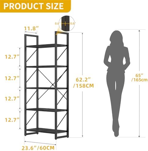 DWVO 5 Tier Bookshelf, Industrial Bookshelves Open Shelf Bookcase, Storage Shelves Organizer Display Rack for Bedroom,Living Room,Office,Kitchen, Charcoal Gray