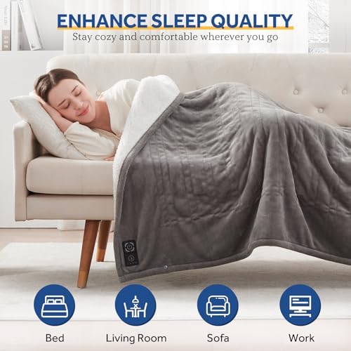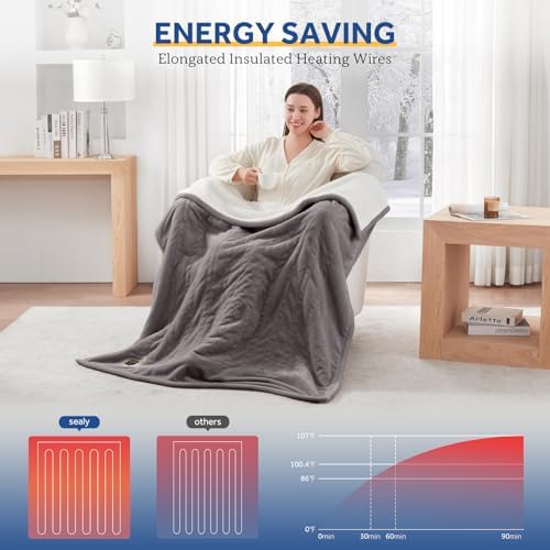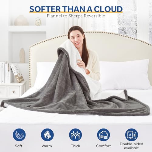 Sealy Heated Blanket Throw with Built-in Button Controller, Reversible Flannel to Sherpa Electric Blanket with 2-10 Hours Auto-Off & 4 Heating Levels, Over-Heat Protection, 50x60 inch, Light Grey