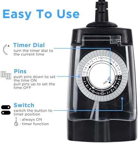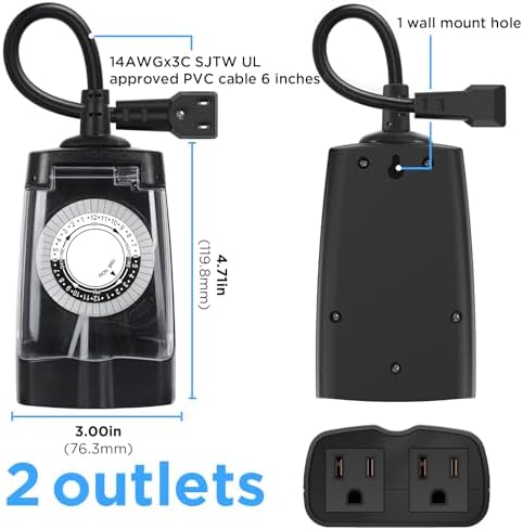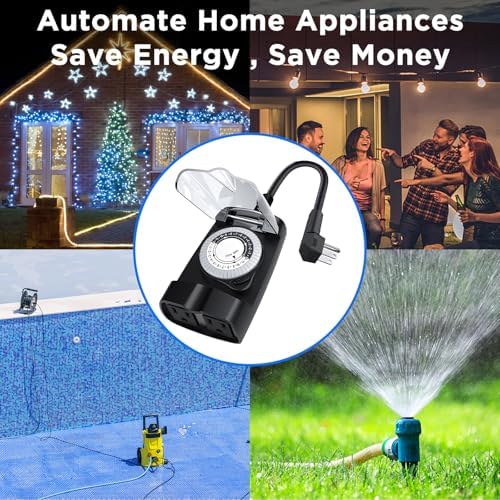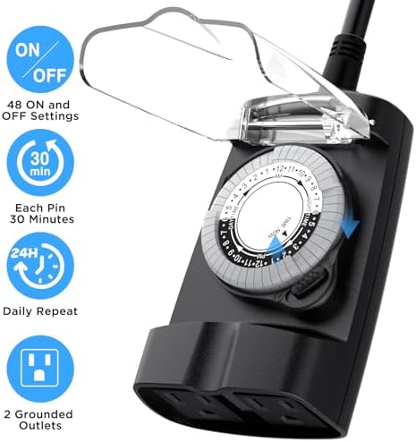G-ELEK Outdoor Timer Waterproof, 24 Hour Light Timer, Timers for Electrical Outlets, Ideal for Pool Pump, Christmas Lights, Heavy Duty, 2 Grounded Outlets, ETL Listed, Black