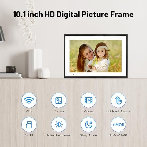 AEEZO Digital Picture Frame,10.1 Inch Digital Photo Frame with 1280 * 800 IPS Touch Screen HD Disply,Built-in 32GB Storage,Wall-Mounted, WiFi Digital Frame Share Photos\/Videos via AiMOR App - White