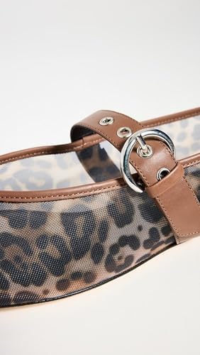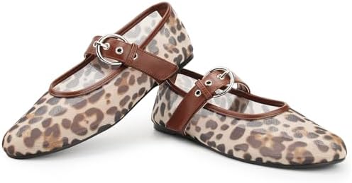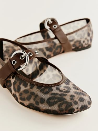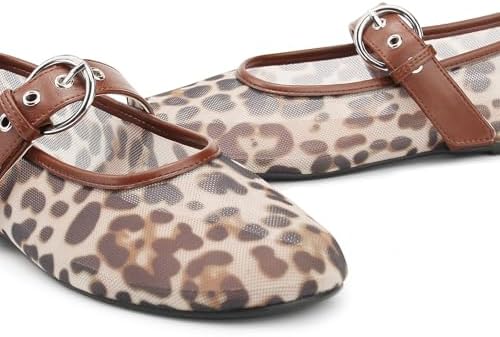 Migpuel Leopard Mesh Flats for Women Round Toe Mary Jane Ballet Flats Buckle Strap Slip On Casual Breathable Ballerina Shoes