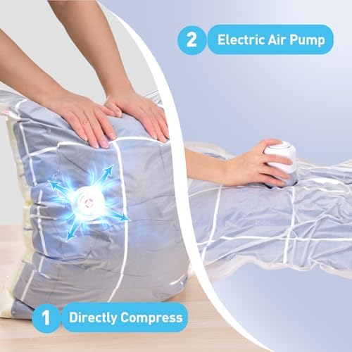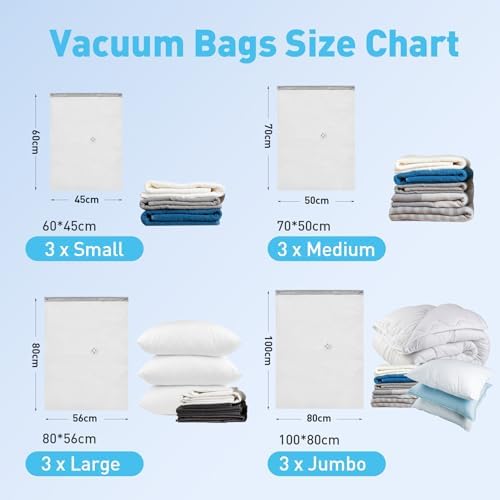 12 Pack Vacuum Storage Bags with Electric Air Pump, Vacuum Seal Bags for Clothing (3Jumbo\/3Large\/3Medium\/3Small), Space Saver Bag for Clothes, Blanket, Duvets, Pillows,Comforters, Bedding,Travel