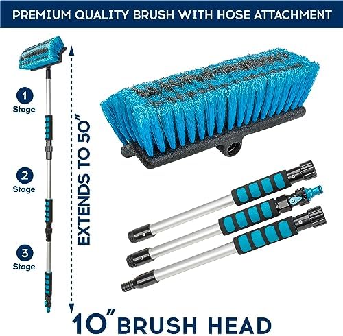 ⭐ Efficient Cleaning: Achieve sparkling clean cars with our Car Wash Brush featuring a hose attachment and long adjustable handle. Easily connect the wash mop to your hose for a steady water supply during the cleaning process. Control the water flow with the built-in on/off water flow switch. ⭐ Detachable Design: Our Car Cleaning Brush features a 50-inch long aluminum alloy rod that is both lightweight and resistant to stretching, bending, or twisting. Design of the Brush with Long Handle ensures effortless completion of all cleaning tasks. ⭐ All In One Solution: With our car wash brush, you have an all-inclusive car wash cleaning solution. Car brush effortlessly adapt to various surfaces and effectively remove stubborn stains and build-up, ensuring a thorough and satisfying cleaning experience for your cars, boats, bathrooms, pools, carpets, furniture and more. ⭐ Hose- Ready Design With the included car wash hose attachment, you can easily connect your wheel brush to any standard garden hose. The water brush has a nipple with a quick connector, which can be connected to a household hose for direct water supply easily. ⭐Customer Service: At DSV Standard, we are confident in the quality of our Car Washing Brush. That's why we offer a full 12-month Warranty against defects and 24/7 customer service support.