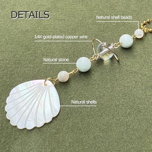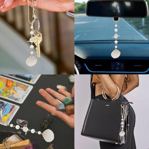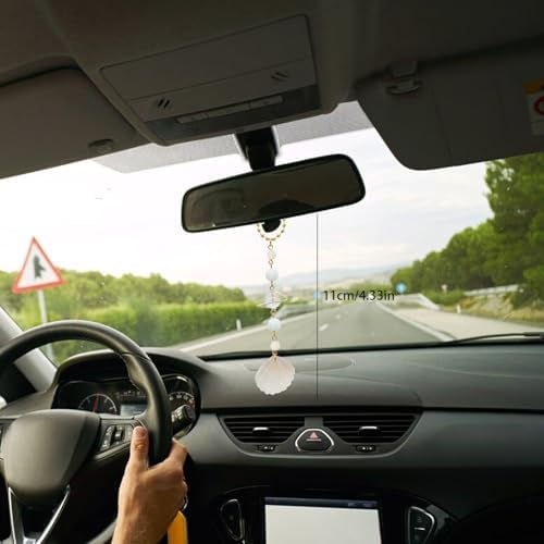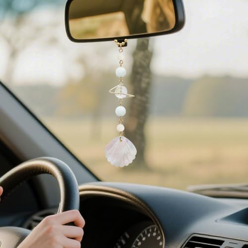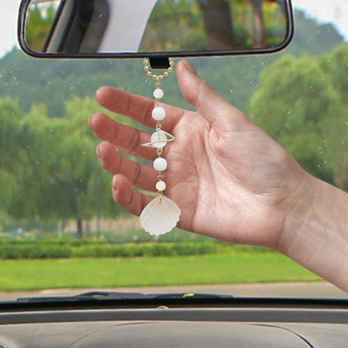 CASONA Beach Car Charm,Seashell Rear View Mirror Decor,Ocean Themed Hanging Accessories,Handmade Aurora Planet Crystal Beads Natural Car Ornament