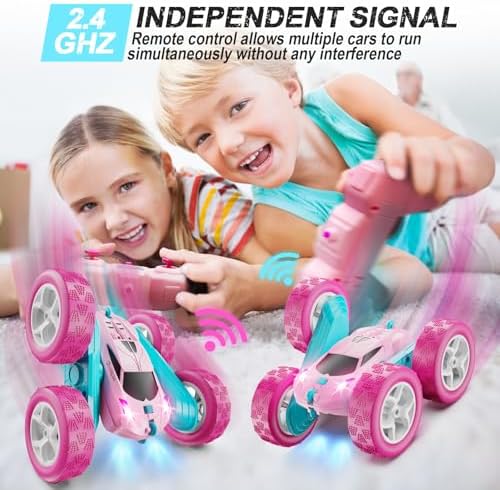 QUNREDA RC Cars, Pink Remote Control Car for Girls, 2.4 GHZ Double Sided RC Stunt Car 360° Rotating Remote Control Crawler with Headlights Car Toys for 6 7 8 9 10 11 12 Girls Birthday Gift
