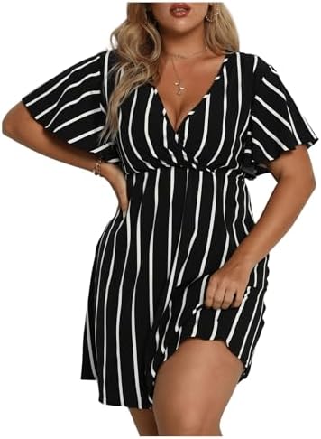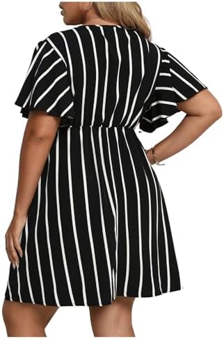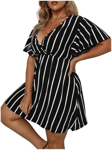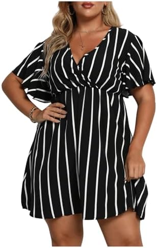 Floerns Women's Plus Size Striped Print Wrap V Neck Short Sleeve A Line Dress