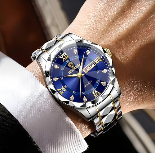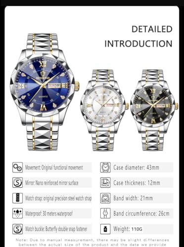 Gosasa Luxury Men's and Women's Business Diamond Stainless Steel Waterproof Roman Numeral Analog Quartz Watch with Day-Date Calendar, Gold and Silver Tone