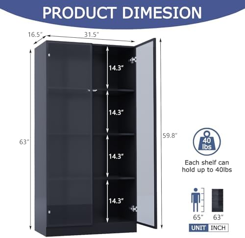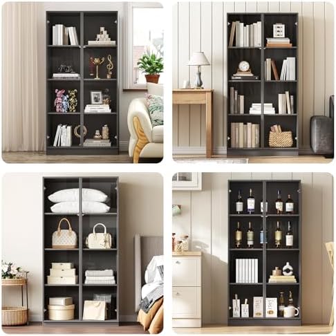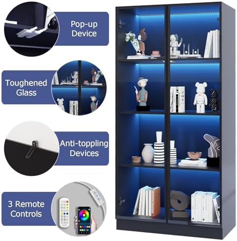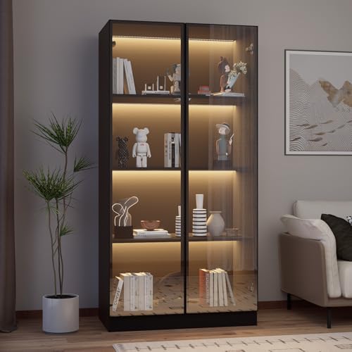 ZORPLIX Glass Display Cabinet with LED Lights, Glass Display Case Bookcase with 4-Tier Shelves, Curio Cabinet with 2 Glass Doors, Storage Cabinet for Collectibles, Living Room