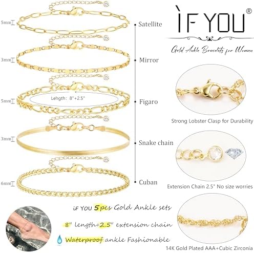 iF YOU Gold Ankle Bracelets for Women, 14k Gold Plated Waterproof Cuban Link Chain Anklets Set, Layered Anklet Bracelets for Women Beach Gift Adjustable Size 5pc