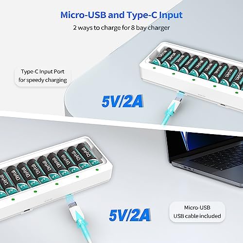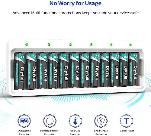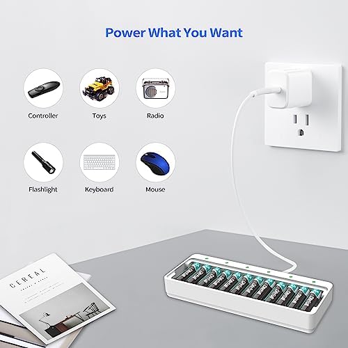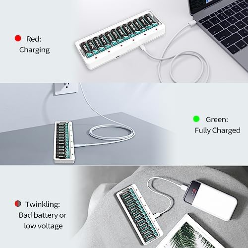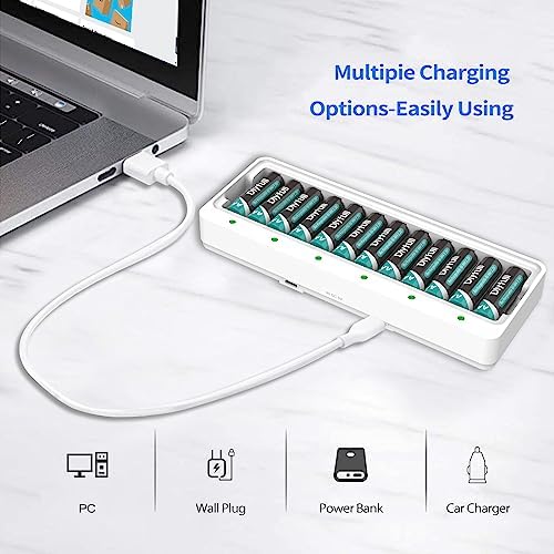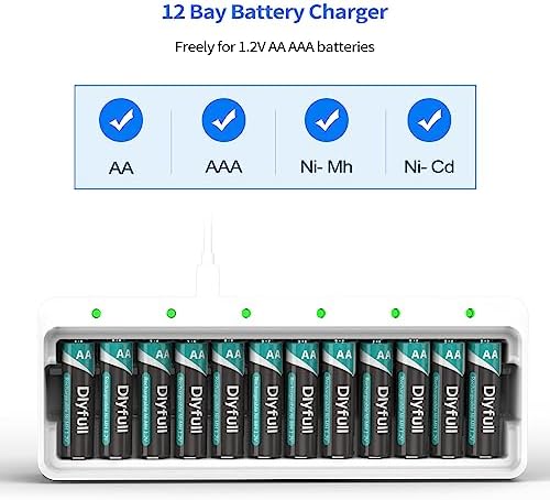 Dlyfull 12 Bay AA AAA Battery Charger, USB and Type-C Selectable High-Speeding Charging for Ni-MH Ni-CD Rechargeable Batteries, USB Cable Included