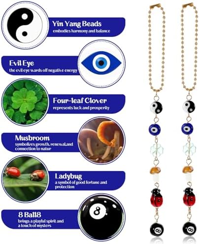 2 Evil Eye Cars Hanging Ornament, Good Luck Car Decor Charm for Rear View Mirror Accessories, Cute Boho Cars Decor Accessories Evil Eye Charm, Yin Yang Four Leaf Clover 8 Balls Car Accessory