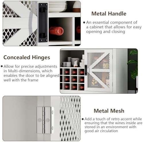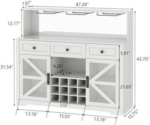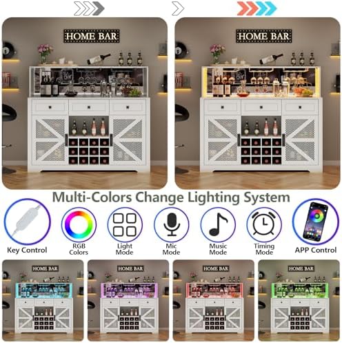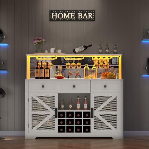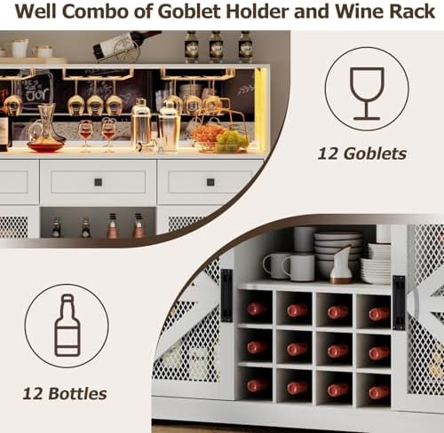 Gyfimoie Farmhouse Wine Bar Cabinet with LED Lights, Kitchen Coffee Bar Cabinet with Acrylic Mirror, Wine & Glass Rack, Storage Shelves and 3 Drawers (Signle Hutch)