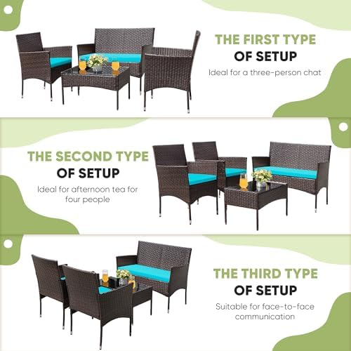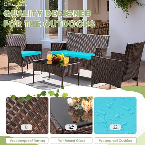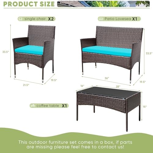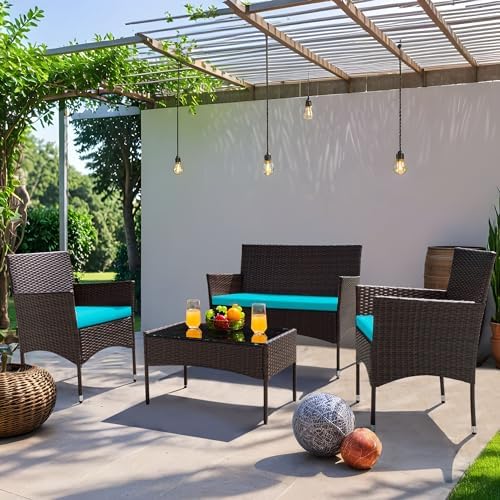 Greesum Patio Furniture 4 Pieces Conversation Sets Outdoor Wicker Rattan Chairs Garden Backyard Balcony Porch Poolside loveseat with Soft Cushion and Glass Table, Brown and Blue