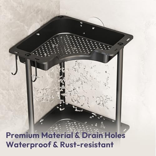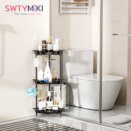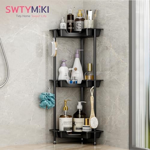 SWTYMIKI Corner Shower Caddy Standing - 3 Tier Rustproof Plastic Shower Caddy, Floor Corner Shelf, Free Standing Rack Storage Stands for Bathroom, Black