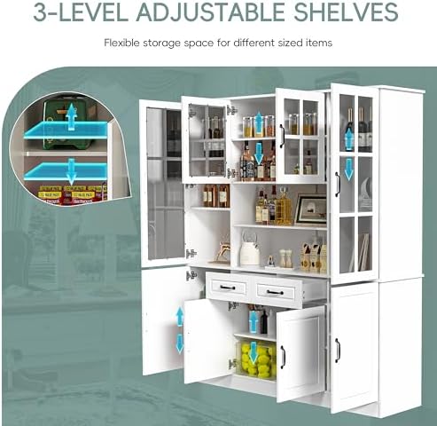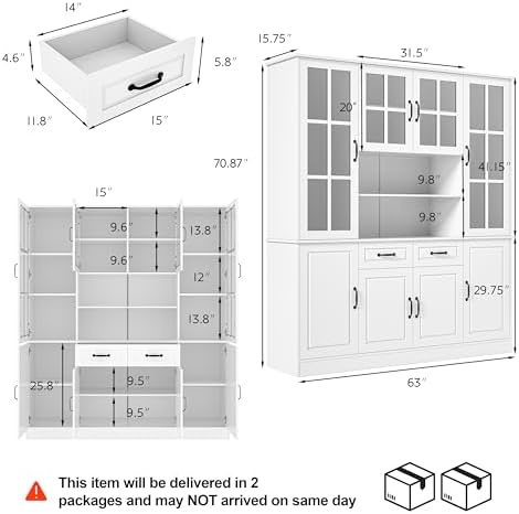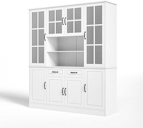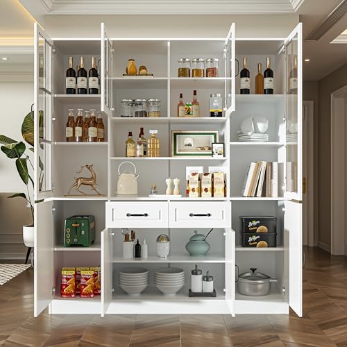 MU Kitchen Storage Cabinet with Glass Doors, Large China Hutch with 2 Drawers & 5 Adjustable Shelves, Kitchen Pantry Hutch for Home Office, Living Room, White (15.8" D x 63" W x 70.9H)